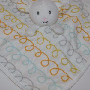 This White Lamb / Sheep Loopy Squiggly Lines Yellow orange Gray Blue Rattle Baby Security blanketis in Excellent clean bright condition. Blanket portion measures 13" x 13" . Blanket portion is a polyester cotton blend - plush lamb head is 100% Polyester - hand wash air dry. Tush tag has been removed unsure of brand name.