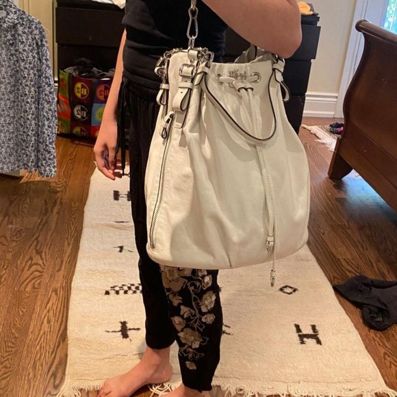 Creamy white leather Coach bag, drawstring and buckle details, 2 different strap lengths