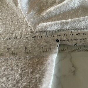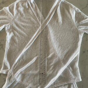 Pretty short to the waist at back bolero style shoulder/arm cover-up with long flow “tails” in the front. Light soft texture in white, semi sheer. Collar can be turned (rolled) down slightly and it has 3/4 sleeves. Goes with everything!
