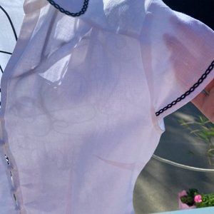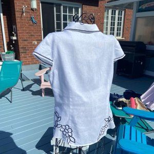 This beautiful linen, tailored blouse has embroidered flowers and embroidered edging. Excellent used condition. Per Una brand purchased in the UK. Darts on the bust and waist for a fitted look. A stunning top! UK size 12.