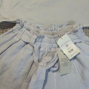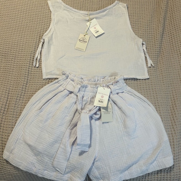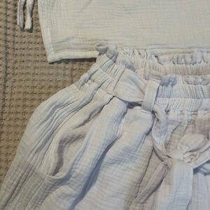 White linen short set. Top is cropped and open at the sides. Shorts have a tie at front and pockets. Top is a S/M. Shorts are a M. Brand new, tags on! Great for vacation! Bought at boutique store.