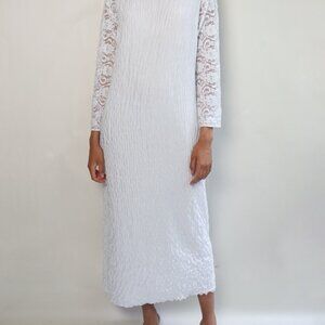 White stretchy dress with long lace sleeves. Machine wash cold. Hang to dry. Polyester fabric.