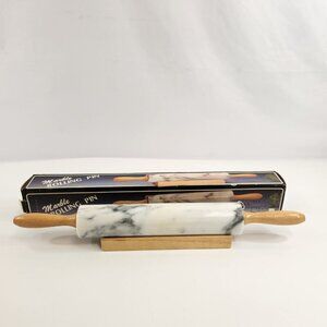 White Marble Rolling Pin Wooden Handles & Stand Gourmet Vintage Boxed