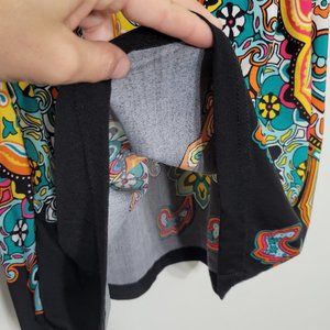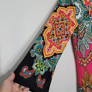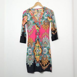 White Mark 3/4 Sleeve Shift Dress Mandala Print Multicolor Stretch Blend V-Neckline Black Trim Pullover Casual Vacation Wear Size Small