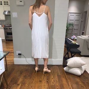 Pleated White Dress is easy to wear on vacation or in warm weather. It drapes beautifully and I like to wear with a belt sometimes. It is lined and the material is a sheen cotton twill.