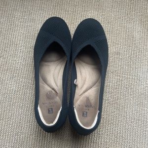 White Mountain brand black synthetic knit upper, white foam sole. Slight wedge, tan cushioned interior. Show signs of wear. Very comfortable and cool, breathable for warm weather.
