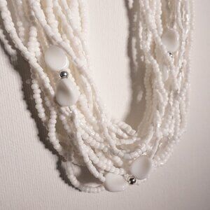 Elevate your jewelry collection with this stunning white multistrand seed bead necklace and matching natural jade bead earrings set. This unique piece features numerous strands of delicate white seed beads intricately woven together, creating a full and textured design that is both elegant and eye-catching. Interspersed among the seed beads are larger white beads and silver-tone accents, adding a touch of sophistication and enhancing the overall aesthetic.
