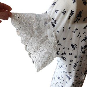 Pristine white lightweight short nightgown and dainty robe with lace trim and sleeve detail- white with navy floral pattern. Ties inside and outside of robe. No stains, marks, or rips, except robe tag has come loose on one side- easily fixable if desired (see final pic). EUC