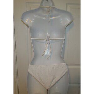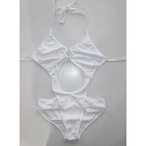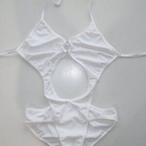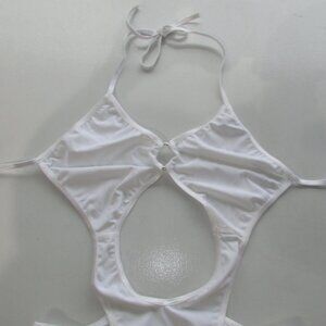 style : very sexy open front, metal o-ring at bust, ties at back and neck, fully open back, unlined so may become semi-sheer when wet