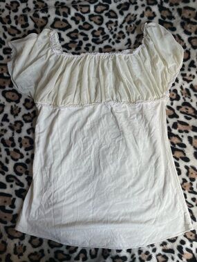 White off-shoulder blouse with a layered ruffle neckline. Lightweight and breathable for comfortable all-day wear. Perfect for the upcoming summer!!💗