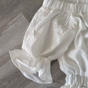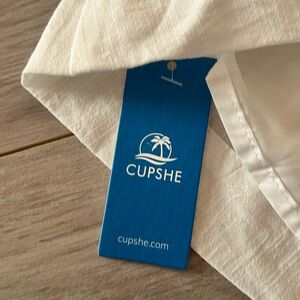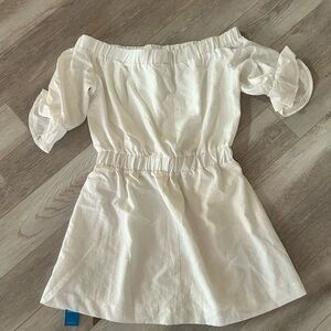 Cupshe off-shoulder cover-up in crisp white. Elasticized waist for a defined silhouette. Short ruffled sleeves add feminine detail. Lightweight fabric layers over swimwear. Easy, chic beachwear option.