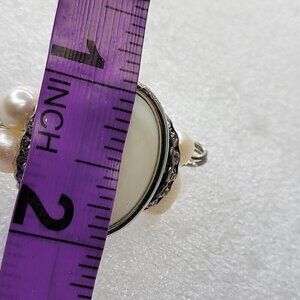 with a white oval shaped stone with a set of 2 pearls on both end