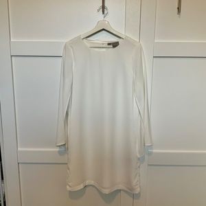 Gorgeous fully lined Vero Moda dress. A-line shape, hits most above the knee, with flowing split sleeves. Elegant and breezy! Perfect for a long table dinner party or your next white party. Pair with sandals or heels.
