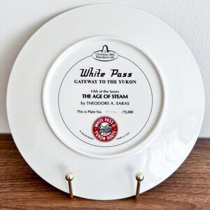 Striking collector plate titled “Gateway to the Yukon”, featuring a classic White Pass steam locomotive cutting through dramatic Alaskan cliffs.
