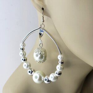 White Pearl with Silver Bead Large Teardrop Earrings Pearl Statement Earrings