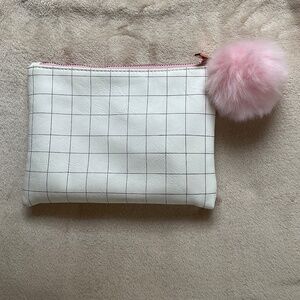 Cute pencil/makeup pouch with pink pompom & inner lining. Rose gold zipper. Some marks on the inner lining of the pouch (see photos), but otherwise in great condition.