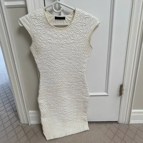 White mini dress by RVN with embossed texture detailing. Body-con fit. Worn only once. Some colour fading.