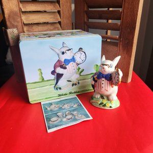 Collectible White Rabbit ceramic figurine from Alice in Wonderland. Designed by Paul Cardew For John Beswick. In a nice collector's tin. Tin is 6 1/4 inches wide, 5 inches deep and 4 1/4 inches high. The figurine is approximately 4 inches tall.