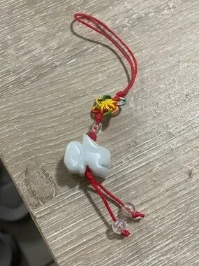 Delicate white rabbit jade charm on a vibrant red cord. Features a colorful knotted detail for added charm. Lightweight and easy to wear as a hair accessory. Bright red cord highlights the white jade rabbit for a classic look.