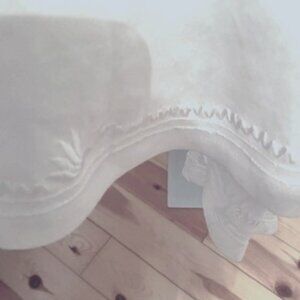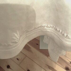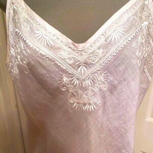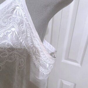 Beautiful snow white Ramie (similar to linen) long dress with spaghetti straps. Gorgeous, delicate and feminine hand embroidery on front, back and hem. Dress is cut on the bias for a lovely flow when wearing, with a slight "V" shaped neckline and princess seams that accentuate your curves. Dress has never been worn but does have a very miniscule amount of dust underneath the arms which I'm confident will come out with cleaning.