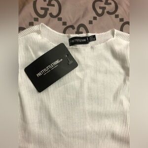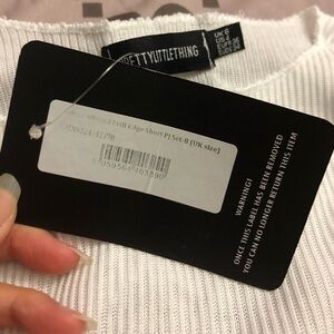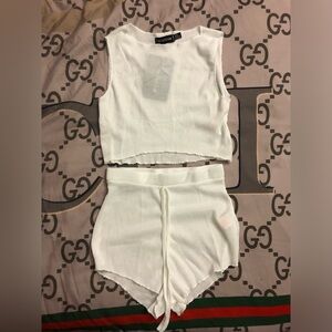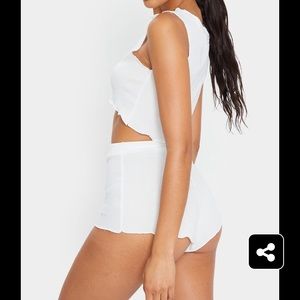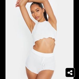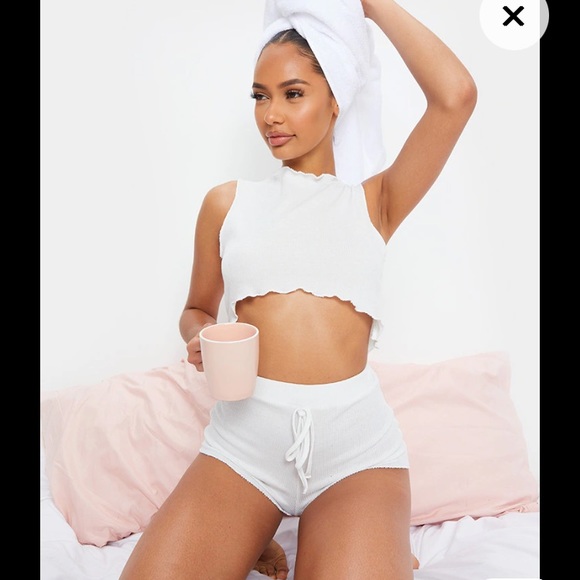We are obsessing over this Pj set for those movie marathon days and beyond. Featuring a frill edge crop top and drawstring shorts, both in white ribbed fabric. Team this with some slippers for the ultimate cosy combo.