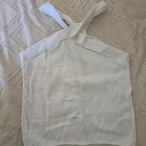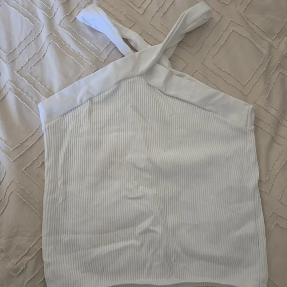 Classic white ribbed halter tank with crossed straps. Soft, stretch fabric for a comfortable fit. Versatile sleeveless design pairs well with jeans or skirts. Clean white color offers a fresh, minimalist look.