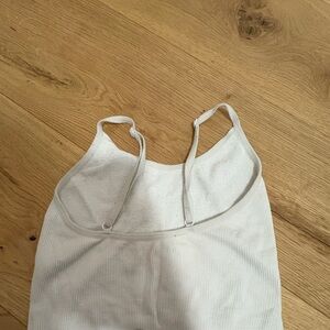 Stylish white ribbed tank top with thin straps. Perfect for layering or wearing alone.