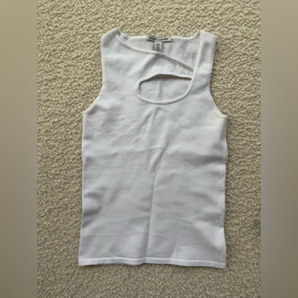 Simple white ribbed tank. Sleeveless design with scoop neckline. Soft stretch fabric. Versatile wardrobe staple.