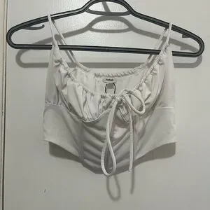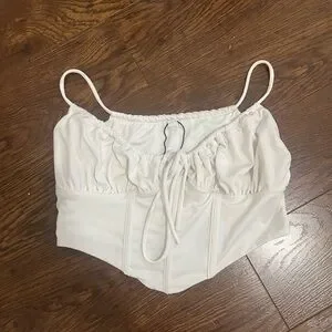not a good top if you have to wear a bra under because it’s so thin but super cute without one. has the corset vibe in the front with three pieces of wire in it. there’s a veryyyy slight pink stain at the end of one of the strings that tie in front but it’s not noticeable unless you REALLY look