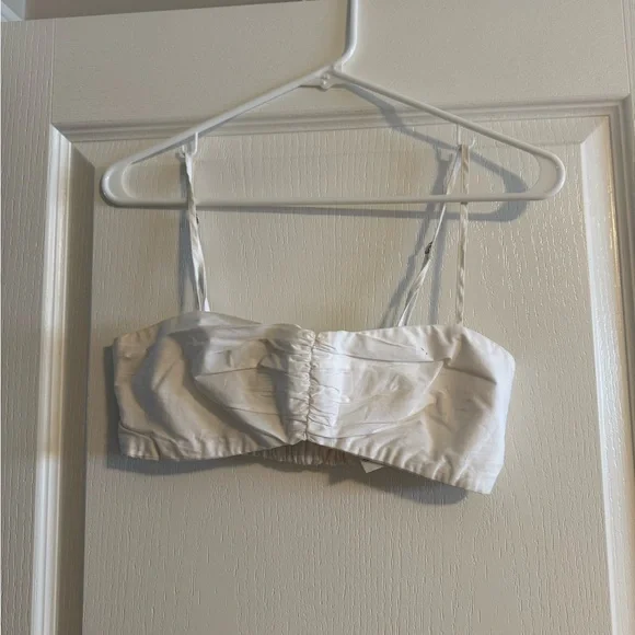 Chic white ruched strapless top with adjustable straps. Perfect for summer outings.