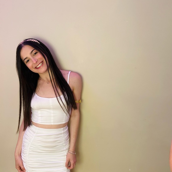 Stylish white two-piece set with ruched detailing. Perfect for any occasion.