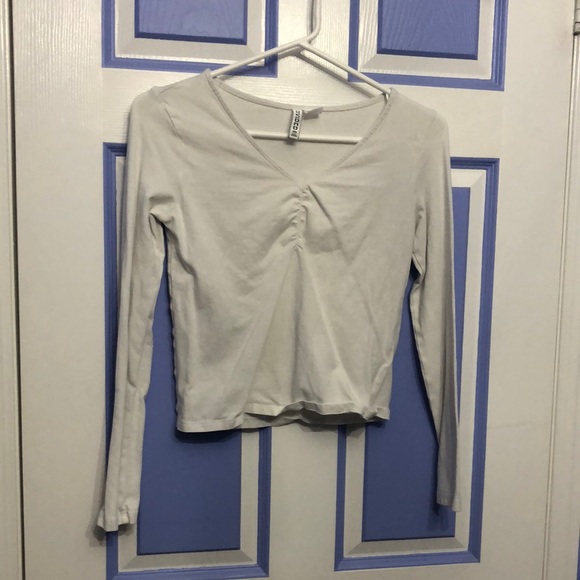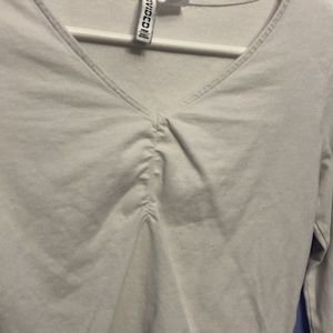 H&M white top, ruched v-neck, worn quite a bit, decent condition, no visible issues