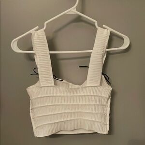 Elegant white ruched top with stylish green bow accents. Perfect for any occasion.