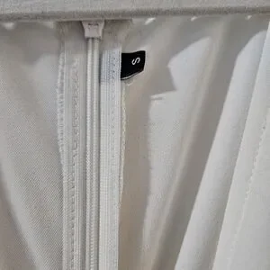 Lightweight white dress with flutter sleeves. V-neck with cascading ruffle skirt panels. Feminine and flowy silhouette. Versatile for day or evening wear.