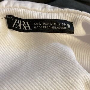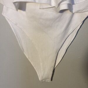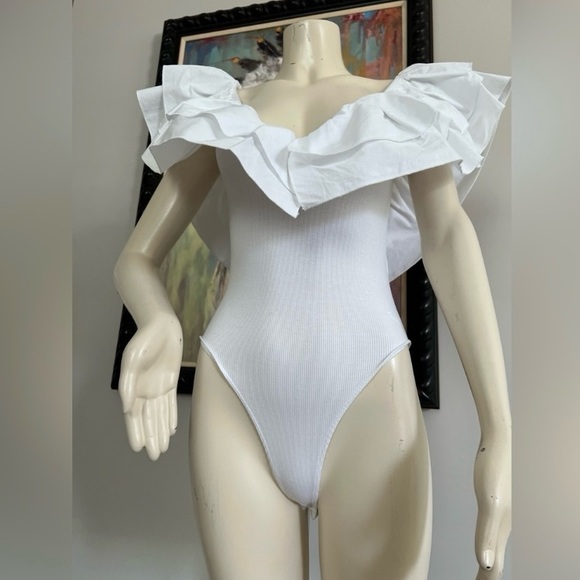 Chic white off-shoulder bodysuit with dramatic ruffle neckline. Soft ribbed fabric provides a flattering, form-fitting silhouette. Lightweight and versatile for day or evening looks. Easy to style with skirts or pants for a polished outfit.