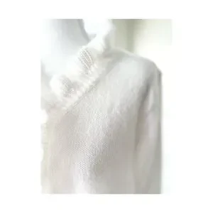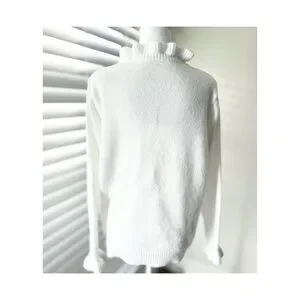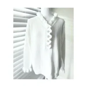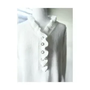 Soft white knit sweater with ruffled V-neckline. Decorative vertical button placket. Long sleeves with subtle ruffle cuffs. Clean, elegant silhouette for layering.