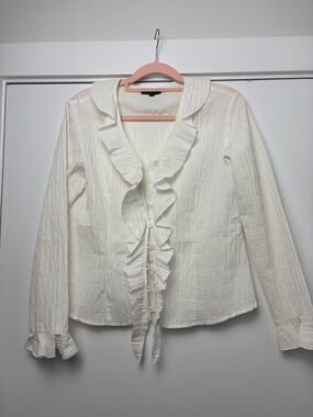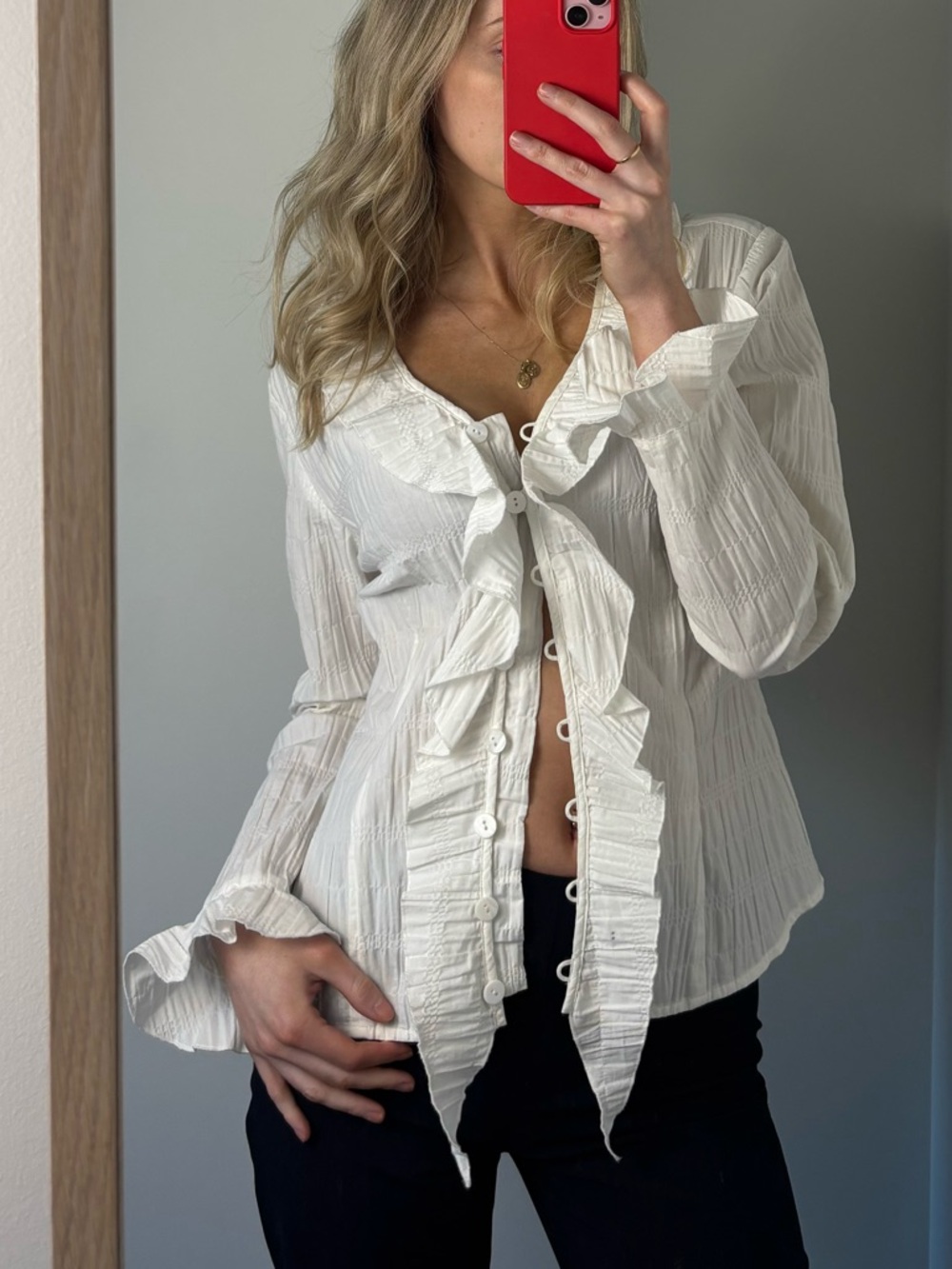 Elegant white blouse with soft ruffle detailing along the neckline and button placket. Lightweight textured fabric delivers a flattering, feminine drape. Long sleeves with subtle flare add a romantic finish. Easy to style for day or evening looks.