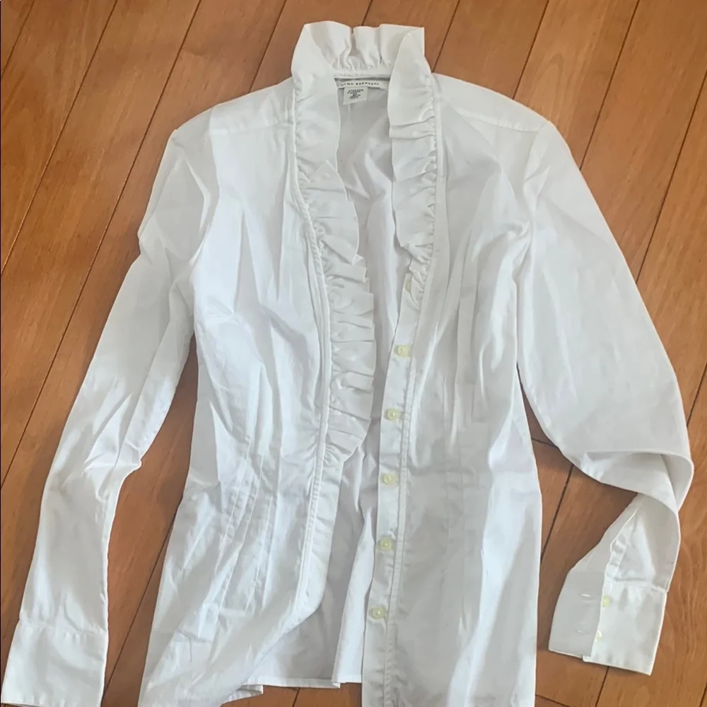 Elegant white button-up shirt with ruffled detailing. Perfect for a chic look/ office siren. Gently worn only 1-2 times. No stains, crispy white