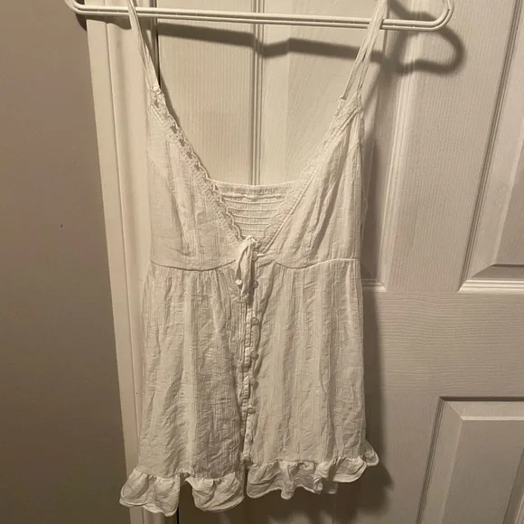 Chic white camisole with ruffle details. Lightweight and stylish. Perfect for layering or wearing alone. Never worn and no stains