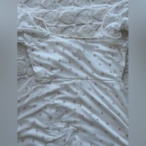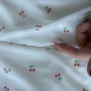Charming white top with small cherry accents. Features a stylish tie detail.