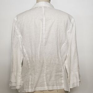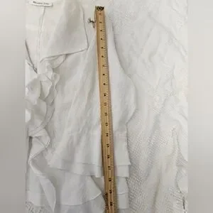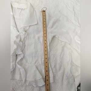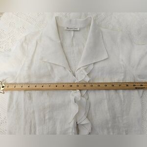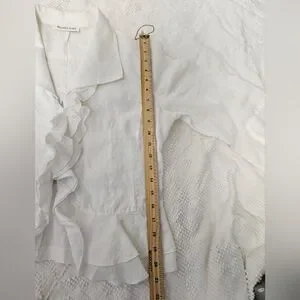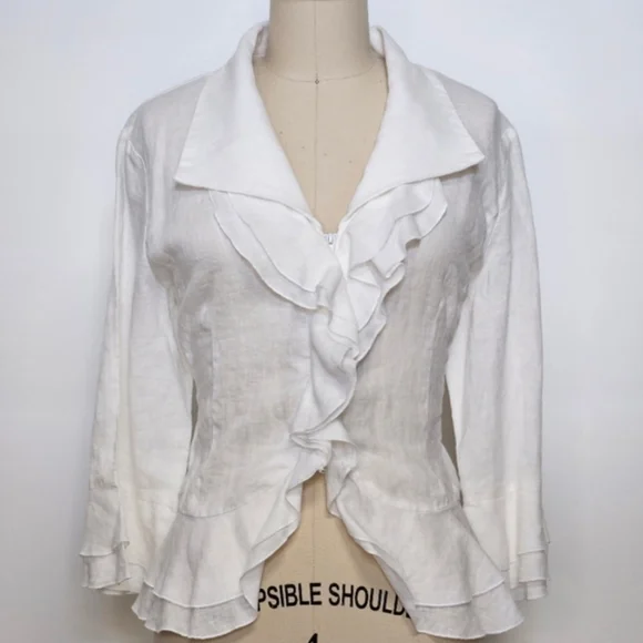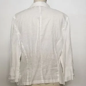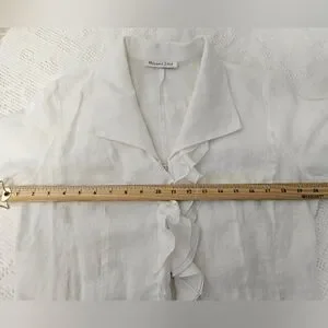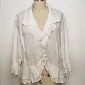 Elegant white ruffled linen blouse with a feminine cascading front. Lightweight fabric and soft collar create a polished look. Versatile white top that pairs well with tailored or casual bottoms.