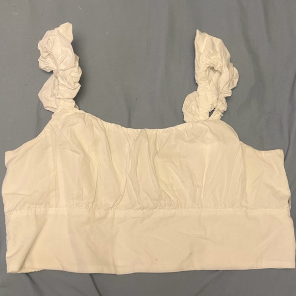 Chic white crop top with ruffled straps. Perfect for casual outings.