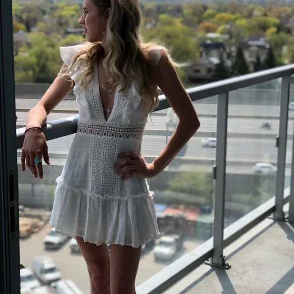 Details: Gorgeous white mini dress featuring delicate ruffles and intricate cutout detailing. Perfect for breezy summer days and garden parties.