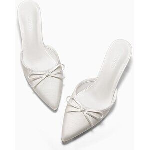 🆕 White Satin Kitten Heel Mules Women’s Bow Slip-On Pumps Wedding Dress Shoes