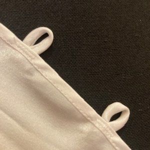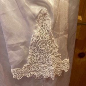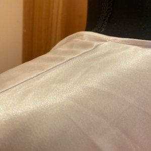 100% polyester, satiny robe. Preloved and in good shape. Has small, almost imperceptible "pull" I tried to show in picture.