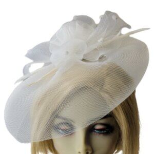 White Saucer Fascinator Mesh with White Rosette Saucer Hair Accessory