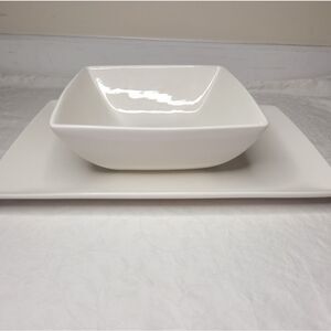 LOT 3 piece Set of Ceramic white serving dishes: Rectangular serving platter and square topped serving bowl, by President's Choice.