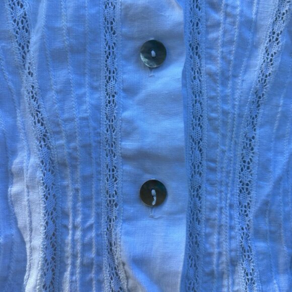Lightweight white button-down blouse with short sleeves, delicate lace detailing, and shell buttons. Relaxed yet feminine, ideal for warm weather or layering under cardigans and blazers.