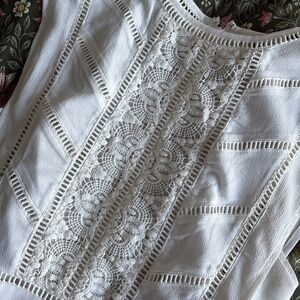 Mini white dress with lace detail. Perfect for bridal shower, rehearsal dinner, or summer party.
