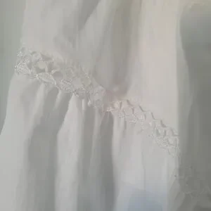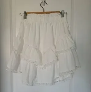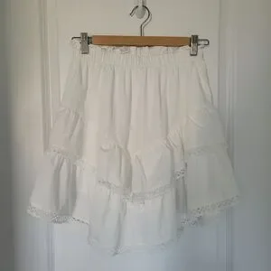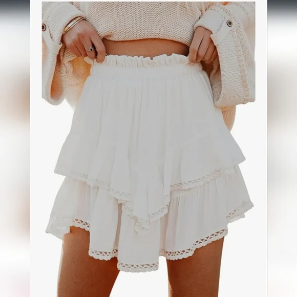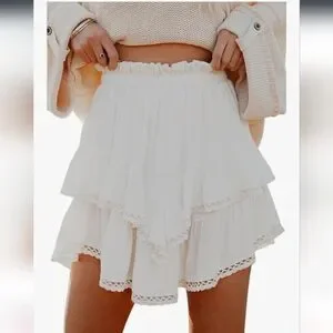 Lightweight tiered mini skort with ruffle layers. Elastic waistband for a comfortable fit. Delicate lace trim accents each tier. Feminine and airy silhouette. Easy to style for casual or dressy looks.